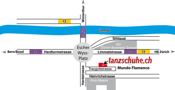 - Tram Nr. 4, 13, 8 oder 17- Bus Nr. 33 oder 72 bis Escher Wyss-Platz, dann Richtung Kino Abaton gehen, beim Restaurant Burgermeister links einbiegen.